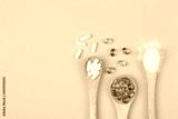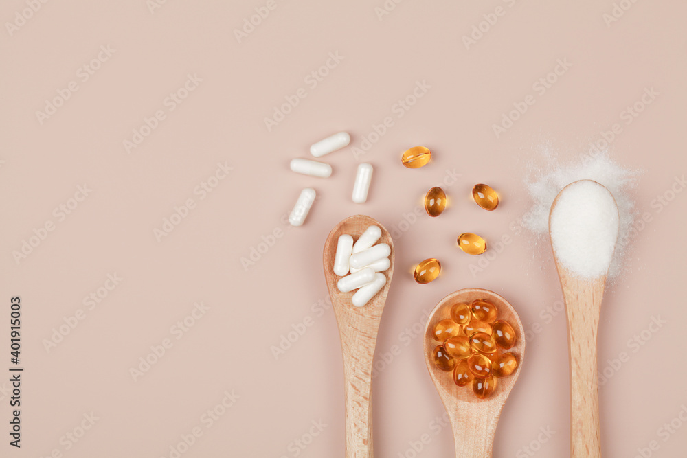 Supplements for health , vitamin D zinc and vitamin C powder in wooden spoons on beige background. copy space top view .healthy lifestyle concept.