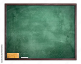 Teacher Day concept: Empty green chalkboard with eraser and white chalk hang on the wall isolated on white background