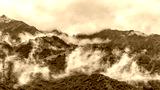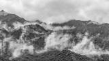 The Alps above Naturno, South Tyrol, Italy, partially covered by layers of low white clouds