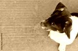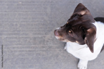 A mixed breed brown and white dog looking off to the left over a stone paved sidewalk in Zhaodong China.