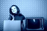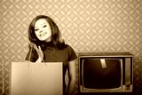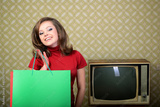 Young charming woman holding shopping bags in room with vintage wallpaper and retro TV set, retro stylization 60-70s