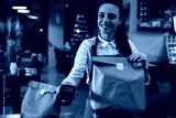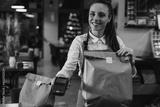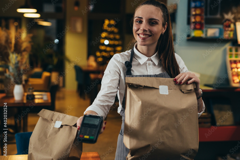 waitress holding prepared takeaway food in eatery. food delivery concept. coronavirus quarantine concept