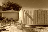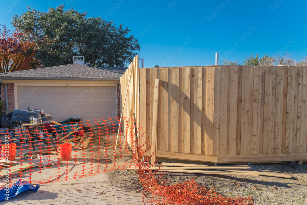 Wooden garden fence installation at suburban residential back alley in autumn in Texas, America