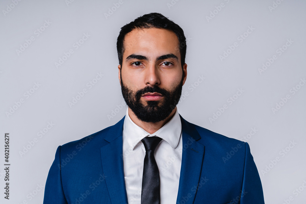 Serious successful Arabian businessman in formal attire isolated over grey background