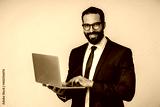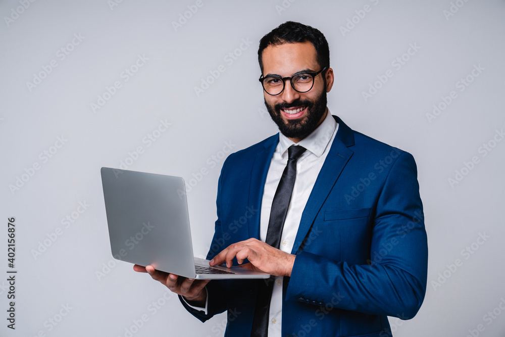 Happy cheerful young islamic businessman in formal clothing using laptop isolated over grey background