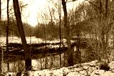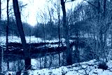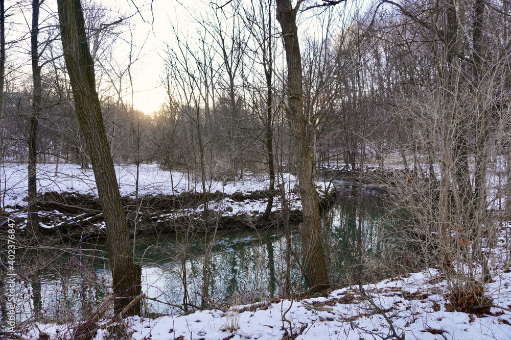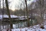 A creek runs through a snowy forest.