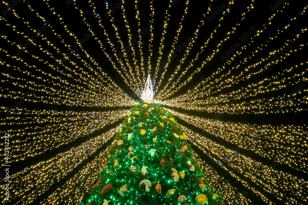 Christmas tree covered with garlands ribbons