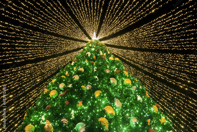 Christmas tree covered with garlands ribbons