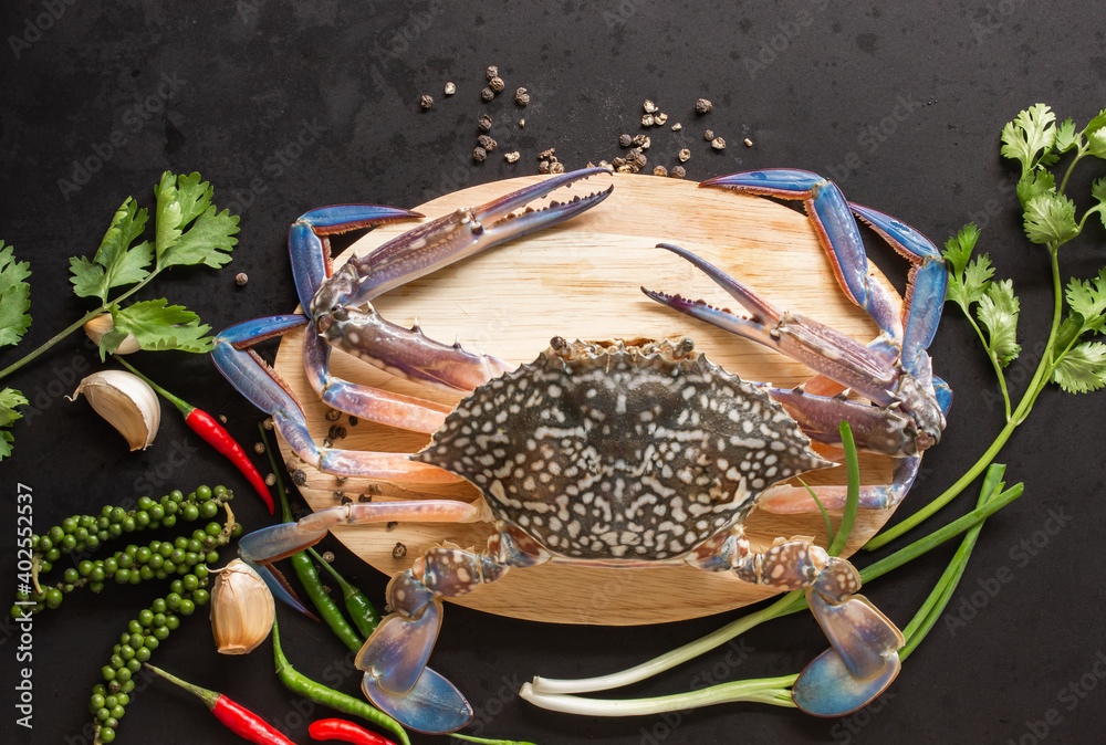 Fresh crab and garnish on a wooden board
