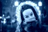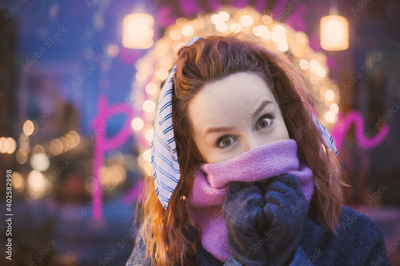 attractive red hair girl against the background of illuminated city lights at night during the celebration of Christmas and on New Year's Eve 2021 during the coronavirus pandemic