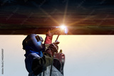 Worker welding position overhead under ballast tank under ship repair in floating dry dock in shipyard