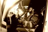 An adult handsome male paramedic is talking on a portable radio while sitting in an ambulance outside a clinic.