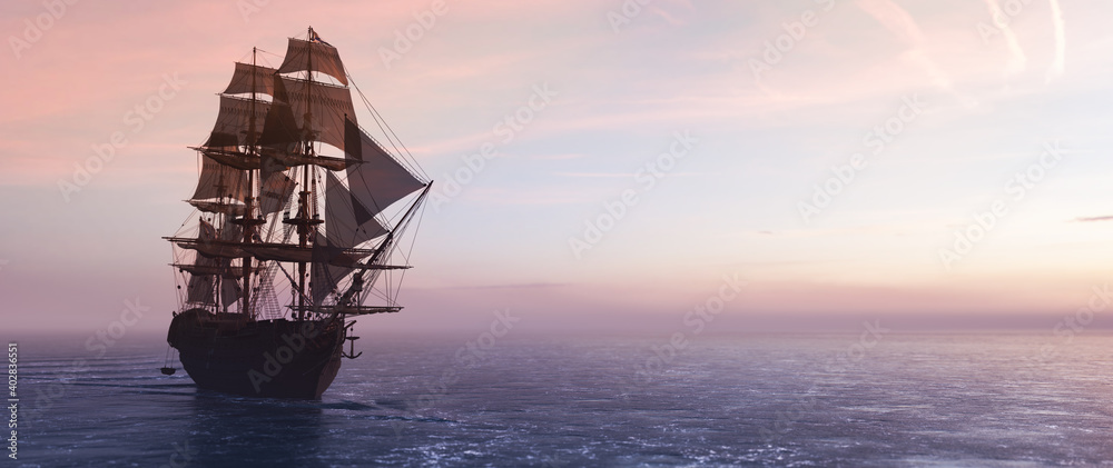 Pirate ship sailing on the ocean at sunset