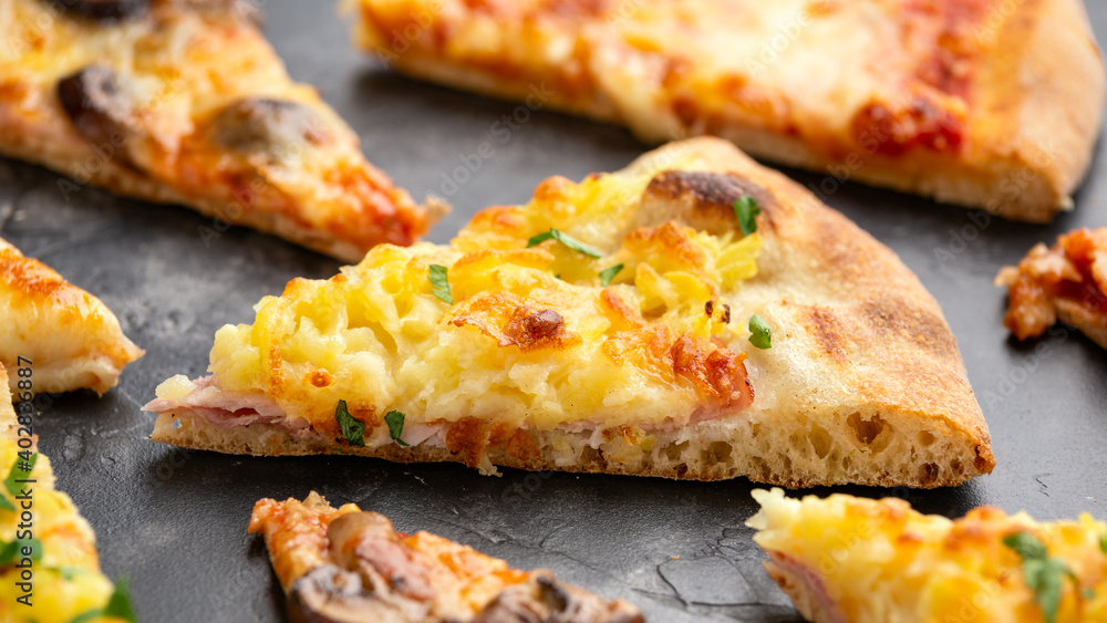 Slices of pizza with different toppings on black table