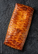 Steak and onion lattice pie on rustic black background