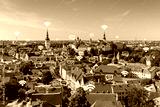 Historic churches, other landmarks and old buildings at the Old Town in Tallinn, Estonia, viewed from above in the summer. Wireless network connection, WiFi, smart city and online messaging concept.