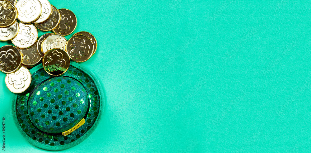 St Patricks day Irish elf hat and gold coins on a green paper background
