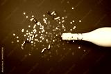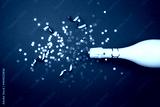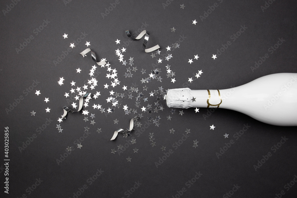 Champagne bottle and confetti on dark background. Flat lay of celebration composition. Top view. Copy space.