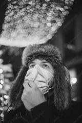 the attractive kind man in a fur hat and face mask with illuminated city lights at night during the celebration of Christmas and on New Year's Eve 2021 during the coronavirus covid-19 pandemic