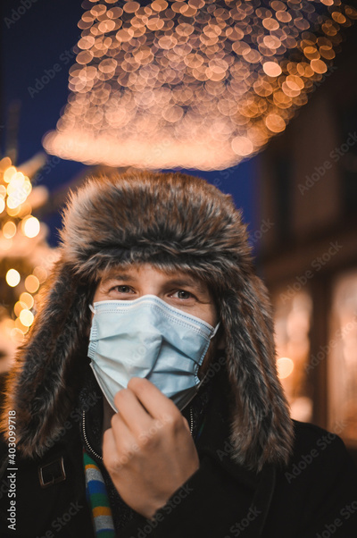 the attractive kind man in a fur hat and face mask with illuminated city lights at night during the celebration of Christmas and on New Year's Eve 2021 during the coronavirus covid-19 pandemic