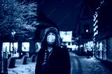 the attractive kind man in a fur hat and face mask with illuminated city lights at night during the celebration of Christmas and on New Year's Eve 2021 during the coronavirus covid-19 pandemic