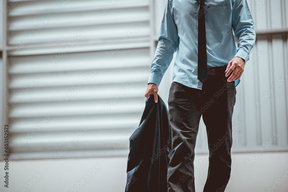 Businessman walking after failure and layoff. Man unemployed from company waliking sad outside at overpass background. Men fired from job. Stress manager sit alone.