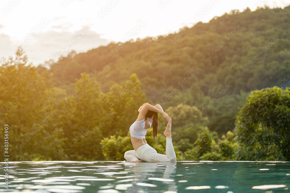 Happy Asian woman wearing white sport wear practice yoga king Pigeon pose on the pool above the Mountain peak in the morning in front of beautiful nature views,Feel so comfortable and relax in holiday