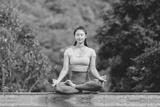 Beautiful Asian woman practice yoga Lotus pose on Mountain peak in the morning in front of beautiful nature views,Feel so comfortable and relax with yoga in holiday