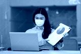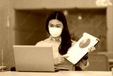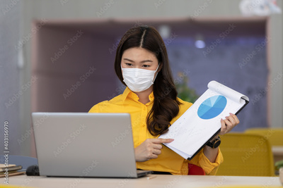 New normal of Asian woman in yellow shirt wearing surgical face mask meeting via VDO conference show sale report and explain in the graph Business startup at modern office or Co-working space