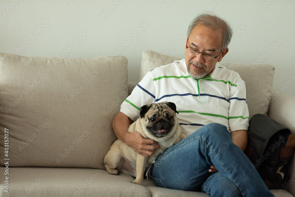 Elderly sit on sofa and playing with dog pug breed in living room at home