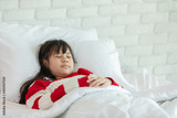 Asian girl kid wearing Pajamas close her eyes smile sleep and sweet dream on bed in bedroom in the morning feeling so relax and comfortable,Healthcare and Sleep Concept