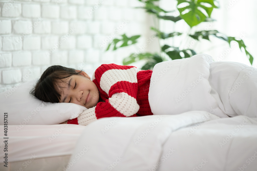Asian girl kid wearing Pajamas close her eyes smile sleep and sweet dream on bed in bedroom in the morning feeling so relax and comfortable,Healthcare and Sleep Concept