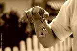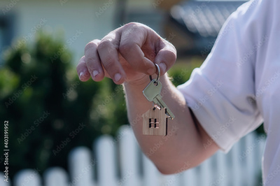 Man holds the keys to the house in his hands against the backdrop of residential buildings. Concept for buying and renting apartments.