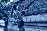 Beautiful caucasian woman in sportswear trains with trx fitness belts in the gym. Beautiful lady exercising muscle sling or hanging straps.