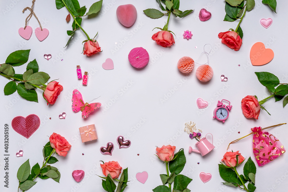 Roses, hearts, gifts, stylish feminine accessories and decorative items in pink color on white background. Greeting card for Valentine's, women's or mother's day. Flat lay, top view, copy space