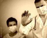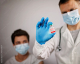 Close up shot of doctor in medical mask and gloves holding ampoule with coronavirus vaccine, nurse holding syringe to make injection to patient in mask, health and care concept, covid-19 protection