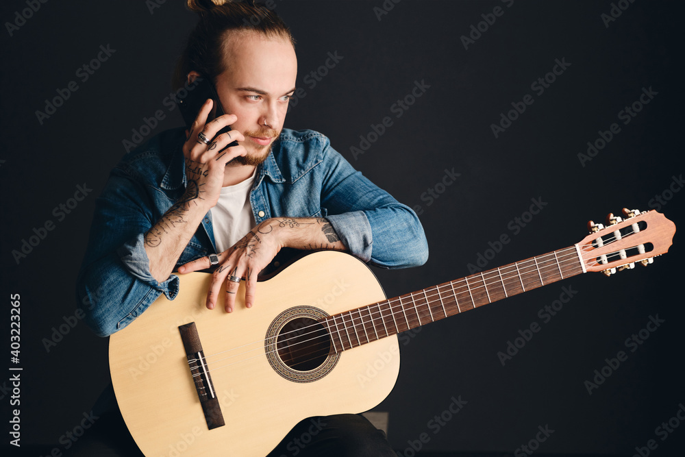 Young tattooed male musician with guitar looking thoughtful talking on phone over black background. Modern technology