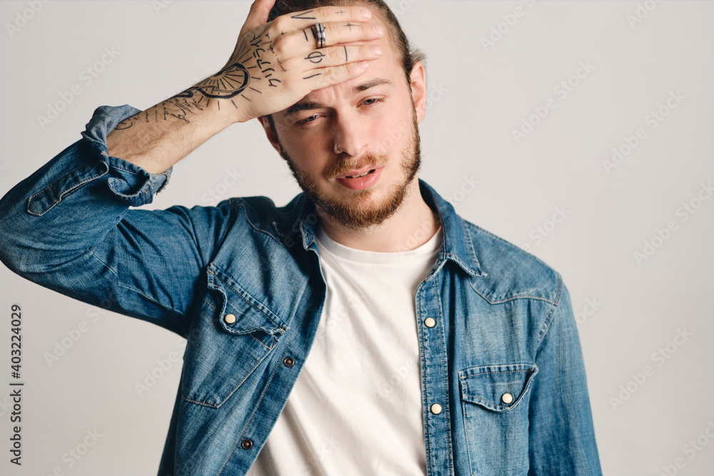 Bearded man with tattoos touching forehead feeling ill isolated on white background. Headache expression