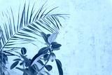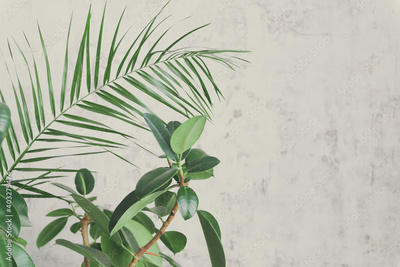 Room palm leaves on grey wall background. Modern floral concept of home garden.