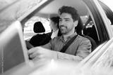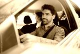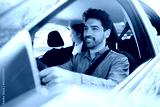 Taxi driver with passenger at back seat.