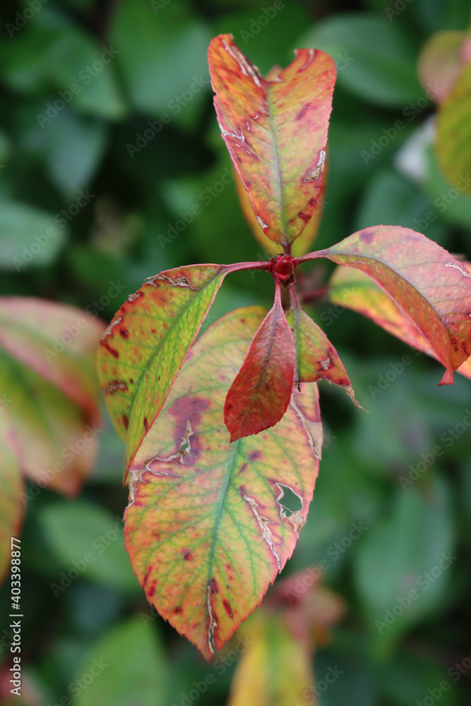 Red robin Photinia with disease. Photinia hedge with red spots on leaves