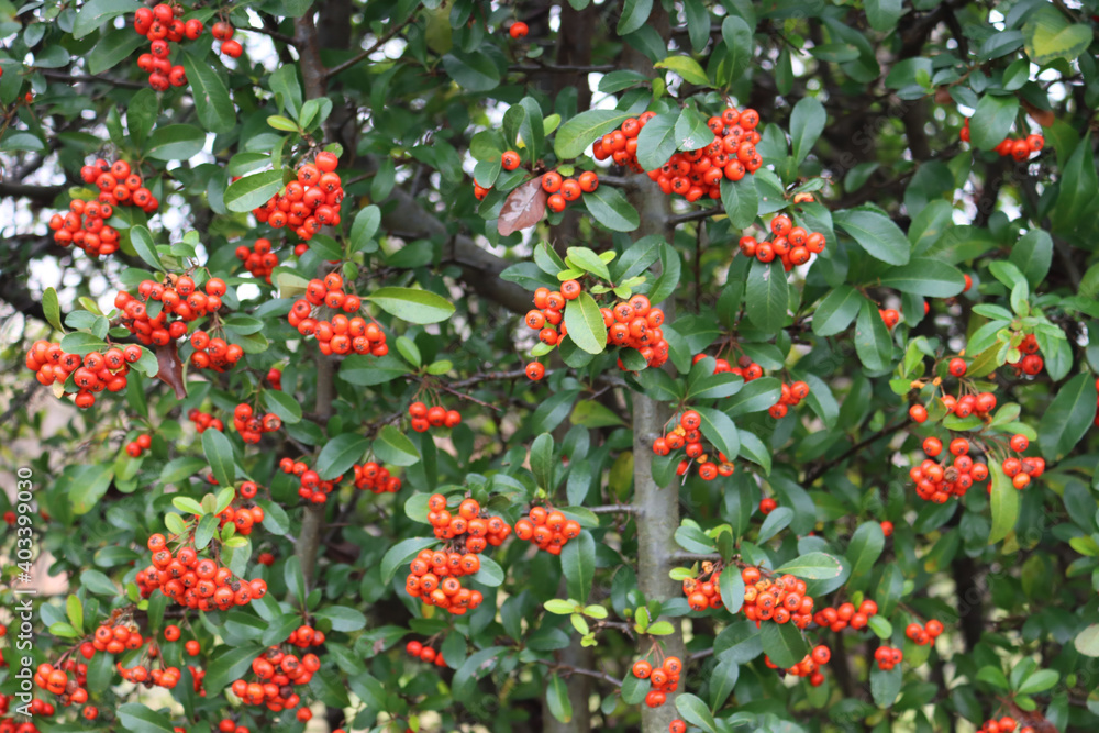 Close-up of Pyracantha hedge with beautiful ripe red berries in the garden