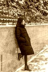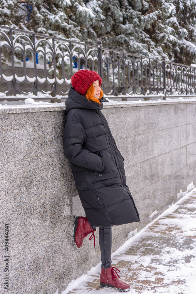 Teen girl wearing casual clothes walking on snow covered city street in winter. Young lady spending weekend in city. Urban vacation, winter holiday, slow life. Fashionable outfit, youth fashion