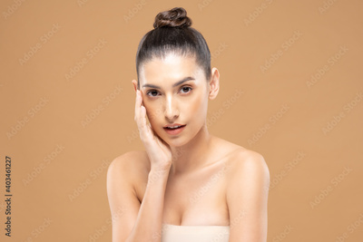 Beautiful Glamour woman touching cheek smile with clean and fresh skin Happiness and cheerful with positive emotional,isolated on Beige background,Beauty Cosmetics and spa Facial treatment Concept