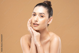 Beautiful Glamour woman touching cheek smile with clean and fresh skin Happiness and cheerful with positive emotional,isolated on Beige background,Beauty Cosmetics and spa Facial treatment Concept