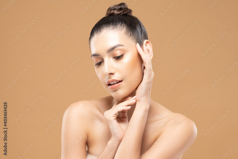 Beautiful Glamour woman touching cheek smile with clean and fresh skin Happiness and cheerful with positive emotional,isolated on Beige background,Beauty Cosmetics and spa Facial treatment Concept