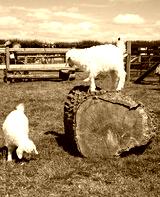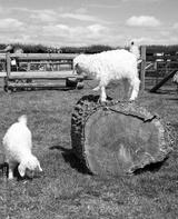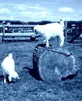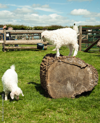 Goats playing on a log