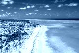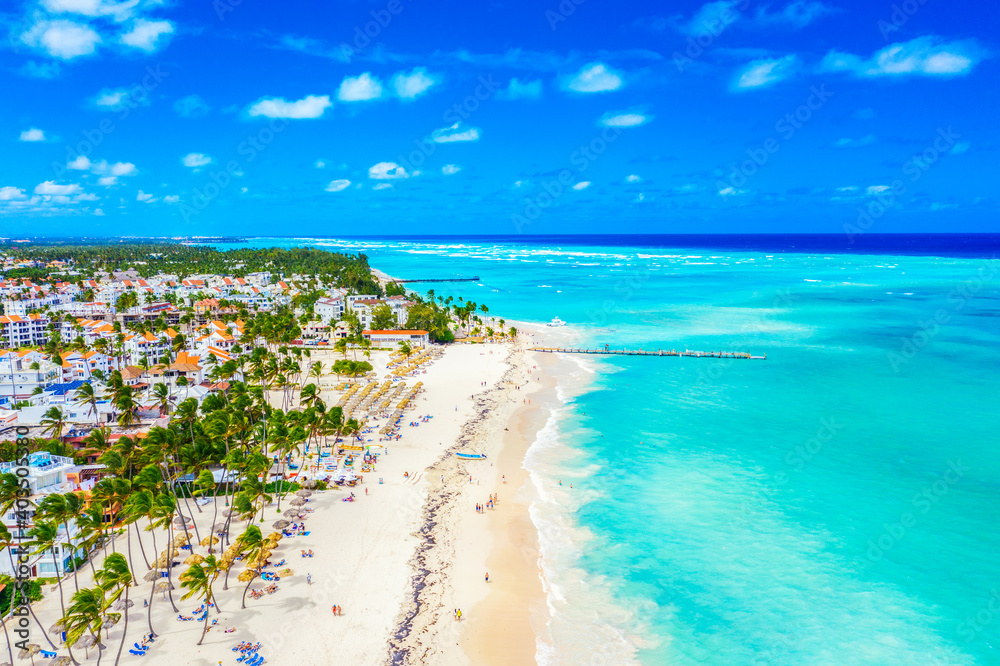 Beach vacation and travel background. Aerial drone view of beautiful atlantic tropical beach with straw umbrellas, palms and boats. Bavaro beach, Punta Cana, Dominican Republic.