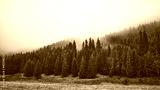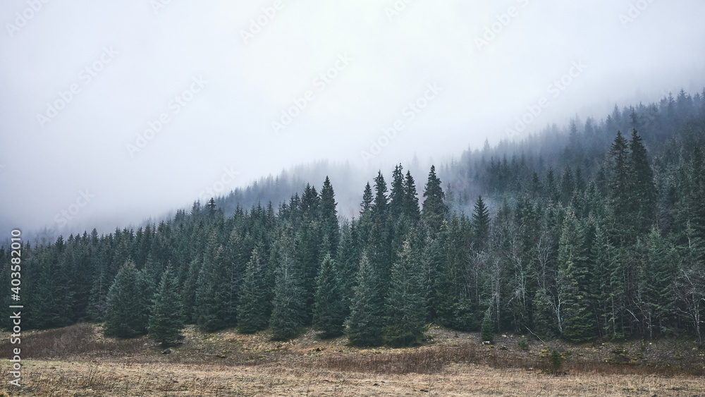 Dark foggy mountain landscape on a rainy day, color toning applied.