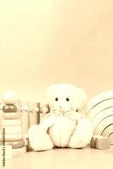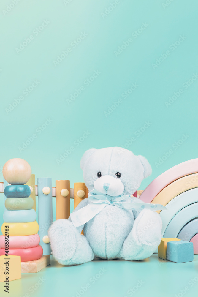 Kids toys collection. Teddy bear, wooden rainbow, train and baby toys on light blue background